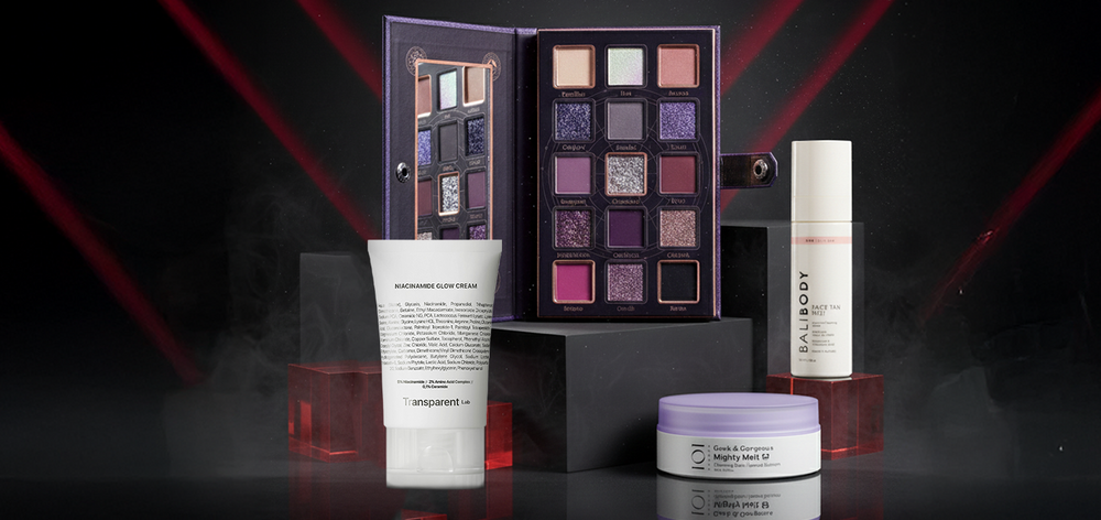 Vier Hautpflegeprodukte und eine offene Lidschattenpalette auf einem dunklen Hintergrund mit roten Lichtstrahlen.
