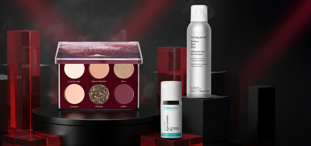 Eine Make-up-Palette, eine silberne Spraydose und eine kleine Hautpflegeflasche auf einem schwarz-roten Hintergrund.