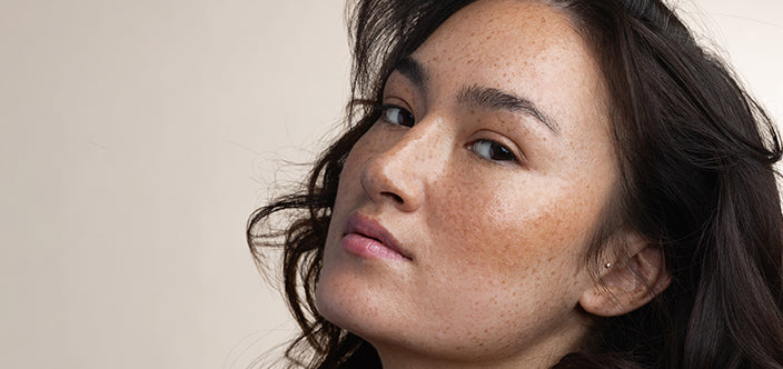 Nahaufnahme einer Person mit Sommersprossen und langen dunklen Haaren, die selbstbewusst in die Kamera blickt.